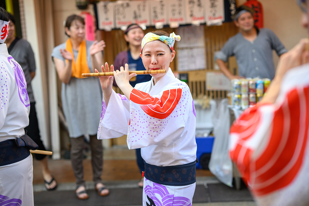 正調を基本として鳴り物全体のバランスを保ち、和楽器ならではのアンサンブルを追求しています。大太鼓・締太鼓・笛・三味線・鉦の音で踊り子たちを輝かせます。初心者の方も大歓迎です!基本から一つ一つ教えていきますので安心して下さい。是非まずは一度練習に遊びに来てください!和楽器の奥深さを体感しましょう! We keep the balance of the entire team on the basis of the traditional melody and pursue the ensemble unique to the Japanese musical instruments. Making the dancers shine with the sounds of bass drums, side drums, flutes, shamisen, and kane. Beginners are welcome! We will teach you the basics one by one, so don't worry. Please come and visit us! Let's experience the depth of Japanese musical instruments!