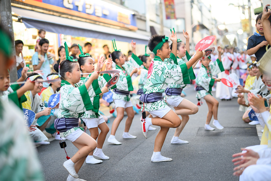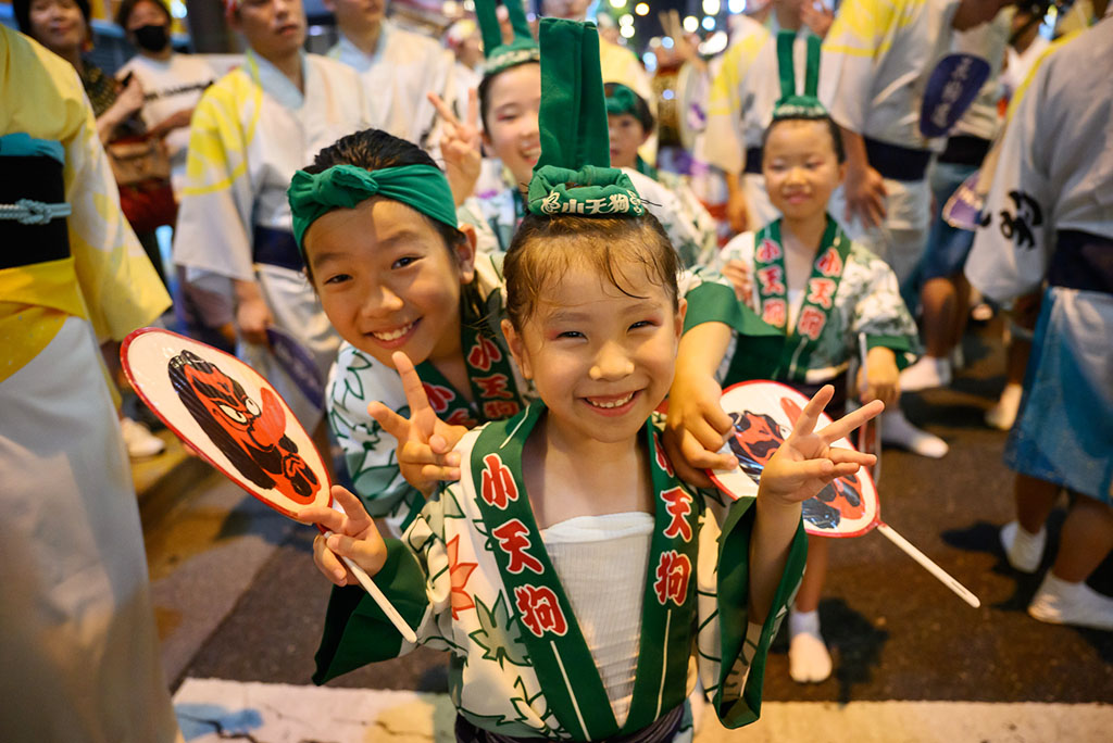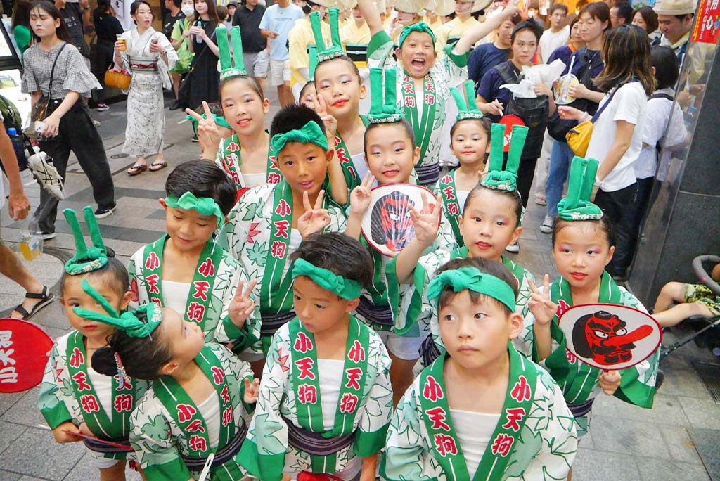 天狗連の中には小学生パートがあり通称「小天狗」と呼んでいます。緑法被(みどりはっぴ)で踊る姿は、可愛いらしくあり凛々しくもあります。とにかく元気な子どもたちの笑顔で溢れています。入連については、保護者の方と良く話しあって決めさせて頂きます。子供達の意外な一面が見え、楽しく保護者の方も参加してもらっています。是非一度、練習を体験しに来てください。 There is an elementary school part in the Tengu Ren, which is commonly called "Little Tengu". Their dance with a green happi coat is cute and dignified. It is filled with smiling faces of energetic children. Before joining the group, we discuss with parents, then decide. The unexpected side of the children can be seen, and parents are also having fun participating. Please feel free to come and experience our activities.