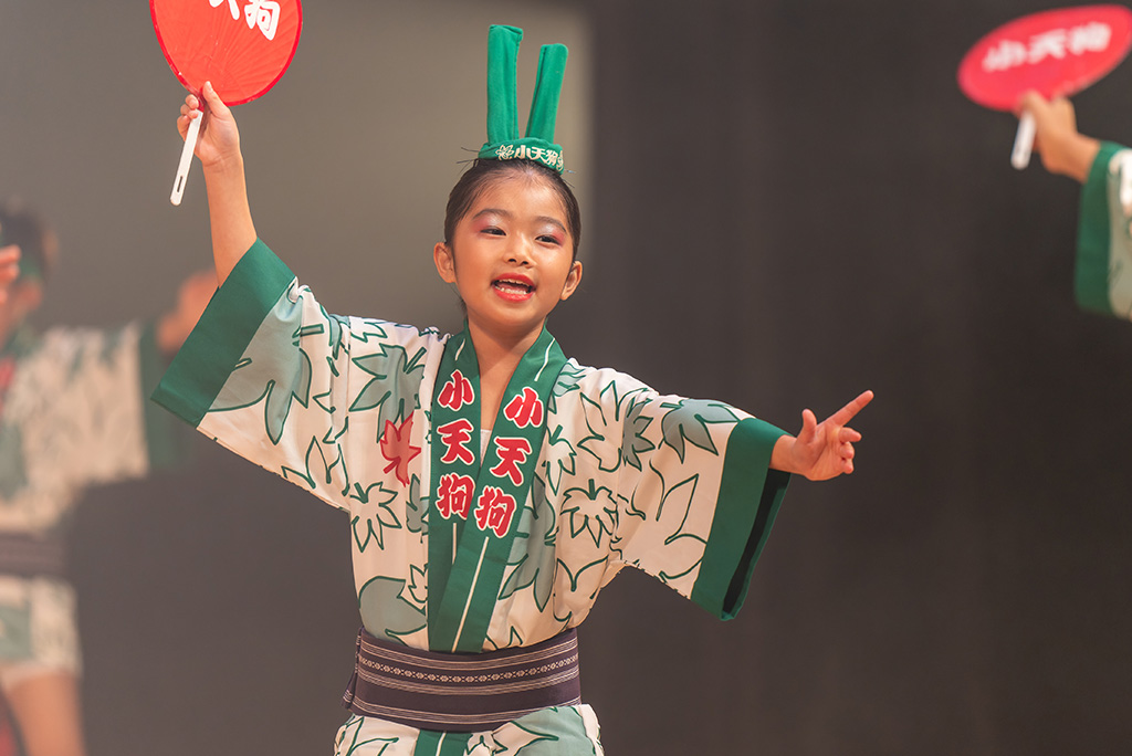 わたしは日本の踊りが好きで、阿波踊りをすすめられて体験に行ったのがきっかけです。みんな上手くて優しくて、絶対ここに入ろうと思って入りました。1年生の6月からやっています。練習はきつい時もあるけど、みんなが優しくしてくれるから頑張れるし、自分も他の子に優しくしようと思えます。休憩時間の時はみんなでお話ししたりするのが楽しいです。自分より年上の先輩や連長に教えてもらえるので、もっと成長できるから練習が楽しみです。本番は大変なこともあるけど、みんなで盛り上がるので人前で踊るのが恥ずかしくなくなるし、お客さんが「上手だね!かわいいね!すごいね!」と言ってくれるので、とっても嬉しい気持ちになって頑張れて自然とニコニコしてきちゃいます。年齢関係なく違う学校の人や大人の人とも仲良くなれるので、天狗連に入って良かったと思います。
