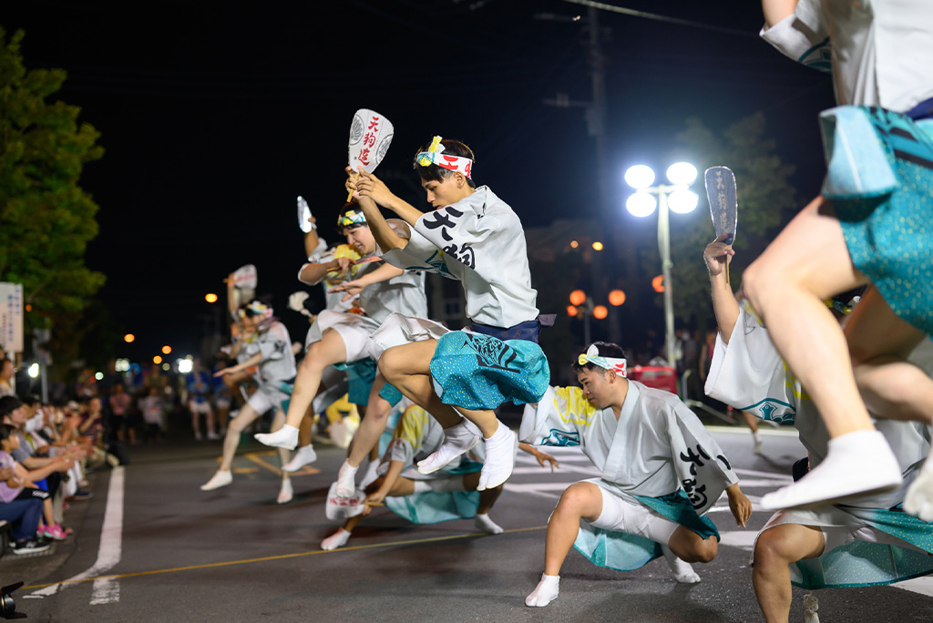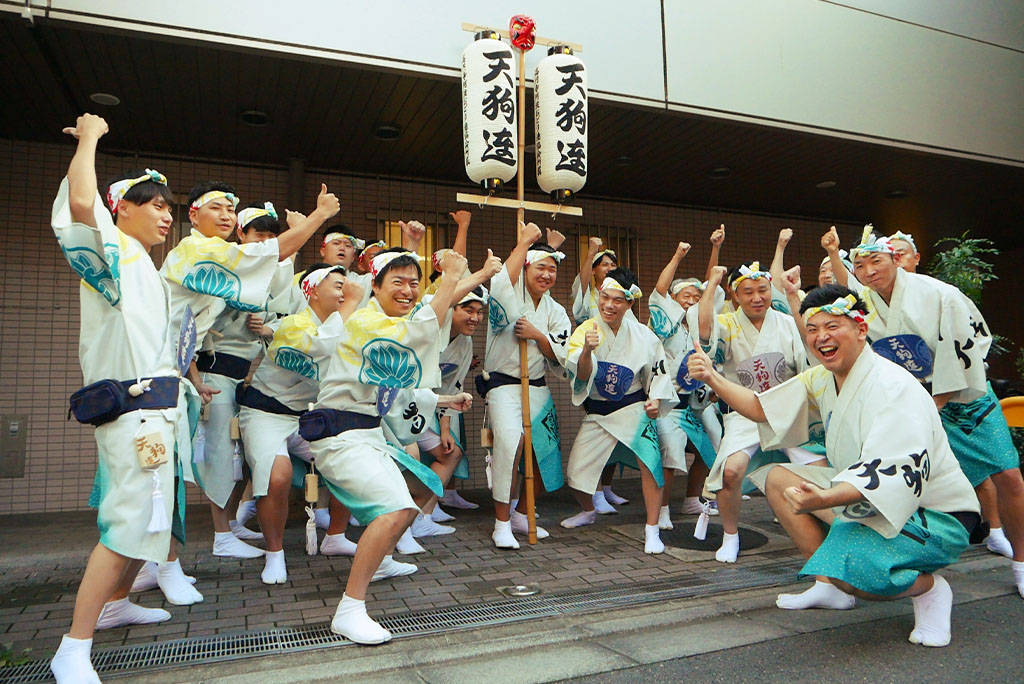 男踊りは時に「激しく豪快に」、時に 「ゆったり繊細に」、男らしく踊ることを目指しています。舞台踊りでは息のあった構成で観客に驚きと感動を、流し踊りでは笑顔と元気で観客の皆様と一緒に楽しむことをモットーに踊っています。是非、天狗連で共に熱い夏を迎えましょう!