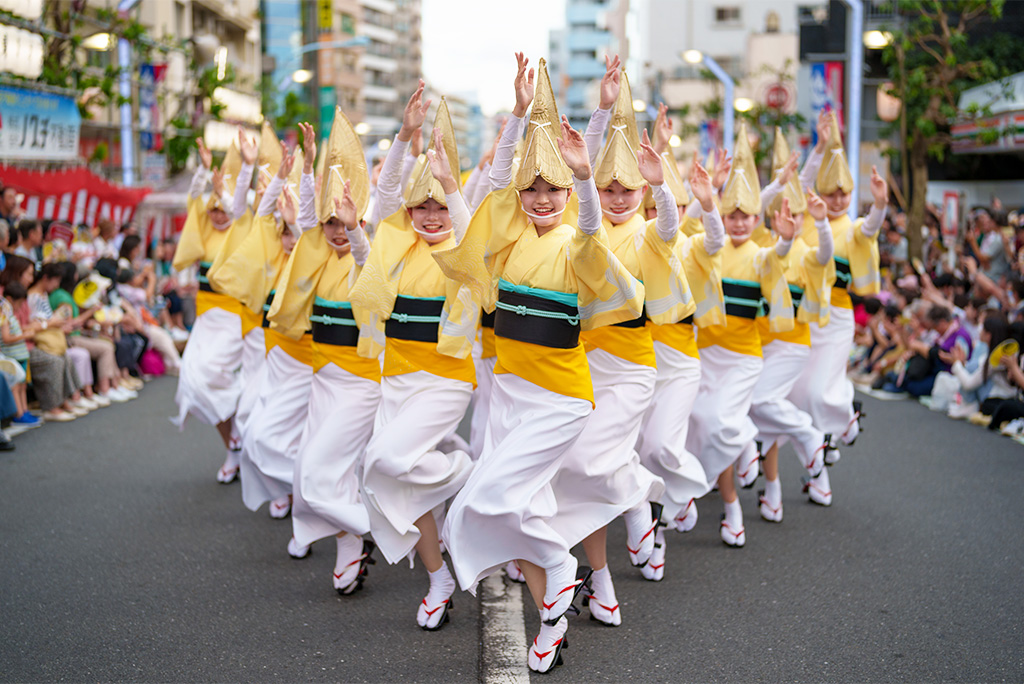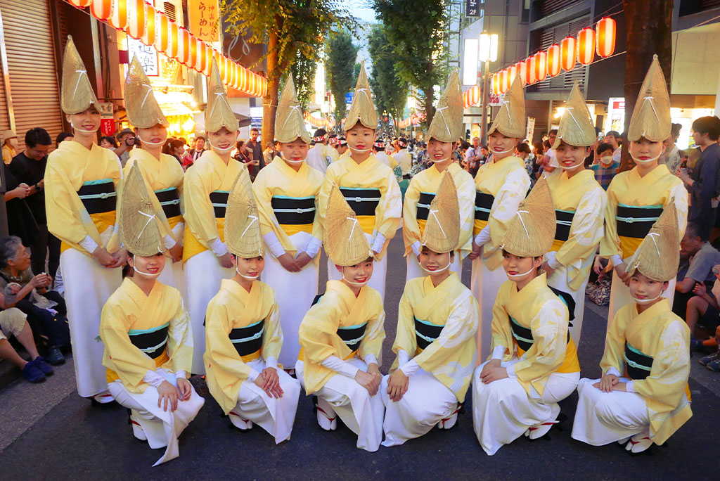 女踊りは子供から大人まで、幅広い年齢層が団結しながら、 より良い踊りを御見せできる様に日々練習に励んでいます。目に鮮やかなレモンイエローの衣装を纏い、品良く優雅でしなやかな踊りを一緒に踊ってみませんか?新メンバーお待ちしております!
